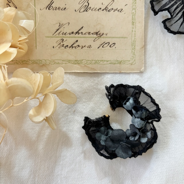 人魚の鱗 布花の耳飾り 片耳イヤーカフ 夢見るような透明感を纏った 人魚の鰭をイメージした耳飾りです ひらひらとした鰭に すずらん 紫陽花 かすみ草の 黒の花飾りを つけた人魚姫 プリーツレースを使用した 軽やかなデザインで 存在感もありつつ 布花の柔らかな色合いがナチュラルに お顔周りを華やかに彩ります カジュアルなスタイルにも エレガントなスタイルにもぴったりな 多様なシーンでお楽しみいただける耳飾りです ⚪︎耳のお好きな位置に引っかけるように着けていただきます 左右のどちらの耳につけるかでお花の向きが変わり違う雰囲気をお楽しみいただけます 締め付けが一切なく軽いため負担が感じられません 耳厚めの方は土台の金具を少し広げてください ⚪︎ 受注生産となります 2週間ほどお時間いただく可能性がございます。 【サイズ】 約4×5センチ(直径5センチの半円のイメージ) 【注意事項】 ※染めた色や形は、自然のもののようにそれぞれひとつずつ異なるため、写真とお届けの商品は同じとは限りません。ご了承くださいませ。 ※布花はほつれやすく繊細な作りをしております。お取り扱いにご注意ください。 ※水濡れにより色落ち型崩れの可能性があります。ご注意ください。